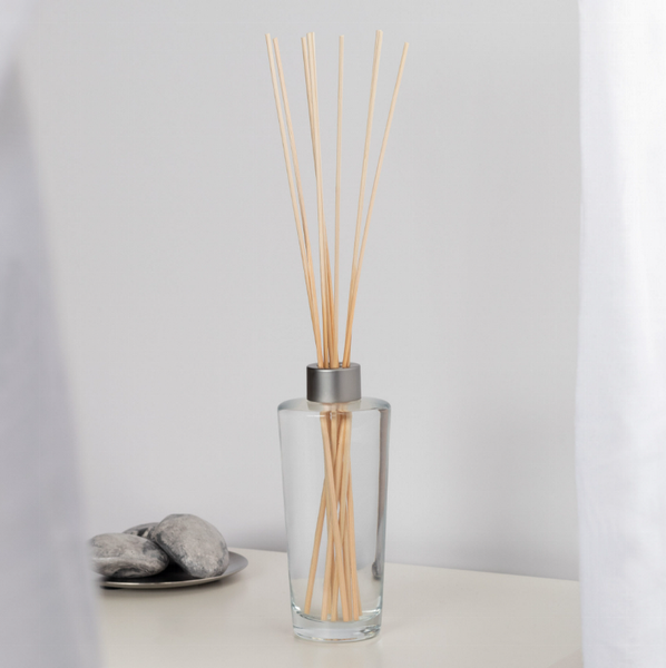 Difusor de ambiente natural a base de varillas de rattan, una maravillosa fibra vegetal que absorbe y difunde la fragancia de una forma progresiva, delicada y muy duradera. Pon el jarrón en el lugar escogido y, a las pocas horas, el perfume empezará a expandirse suave y paulatinamente durante varios meses. Al mismo tiempo que perfuma de manera natural, resulta un original elemento decorativo para el hogar u oficina.