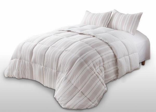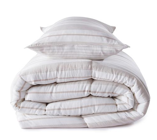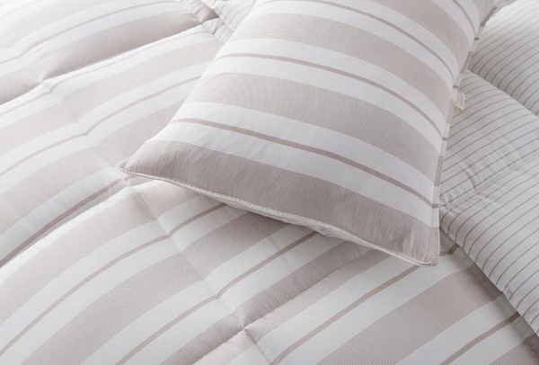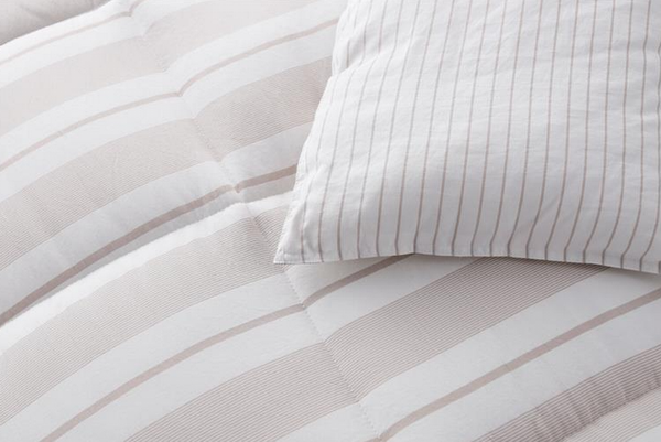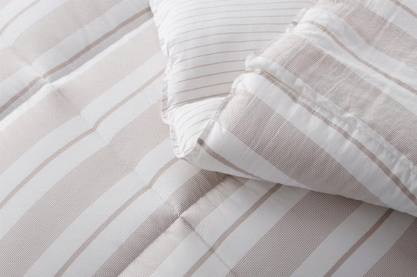 Edredón de rayas de hilo tintado, guateado a cuadros con un relleno ligero que le aporta relieve y su tejido lavado a la piedra le aporta un tacto suave y agradable.