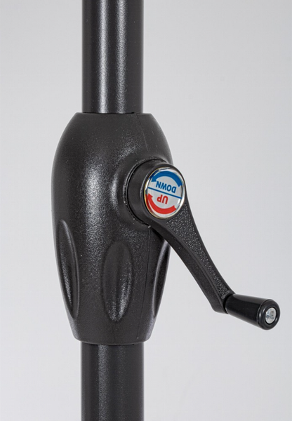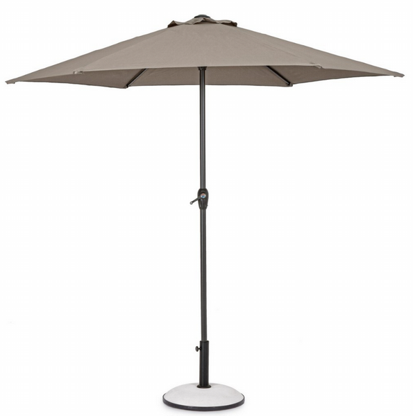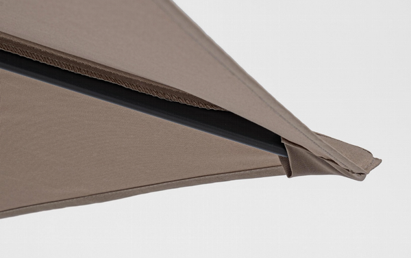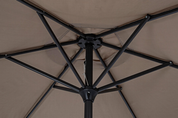 Estructura barnizada con polvo (poliéster). Mástil de aluminio, diámetro: 36/38 cm. 6 varillas de acero tratadas para exterior mediante fostatación. Tela de poliéster color visón con chimenea cortaviento. Base no incluida.